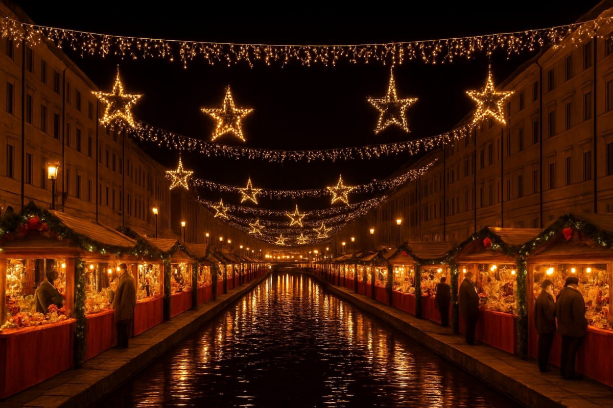 La foto-concept, immaginata sul Canale Grande e condivisa con entusiasmo, ritrae file di casette natalizie illuminate, stelle sospese a perdita d’occhio e un’atmosfera calda, avvolgente, perfetta per esaltare il fascino del centro storico triestino. L’effetto è straordinariamente suggestivo: una galleria di stelle che si specchia nell’acqua, creando un corridoio luminoso che valorizzerebbe l’intera area tra Ponterosso e via Bellini.