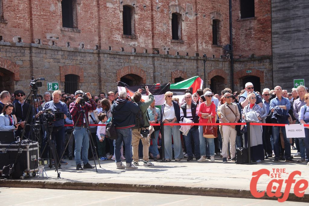 Cerimonia Risiera: bandiere palestinesi mentre si leggono i messaggi della comunità ebraica
