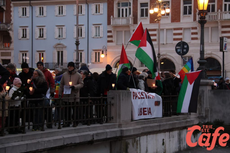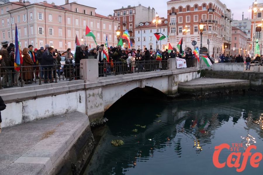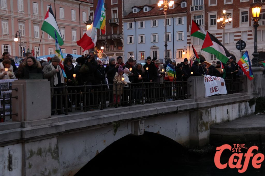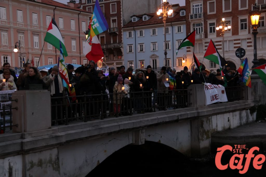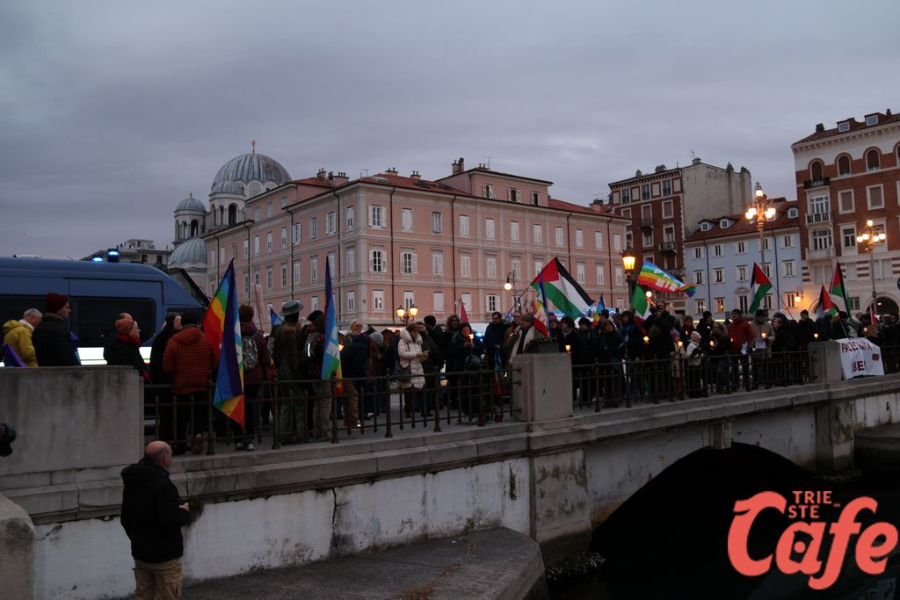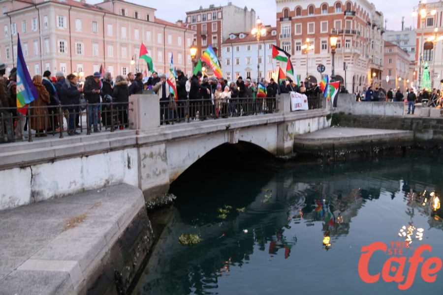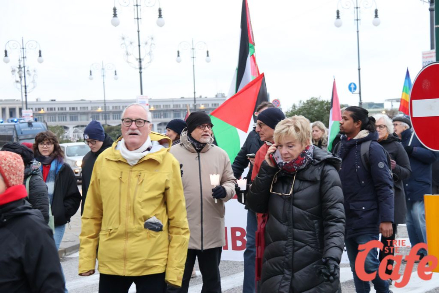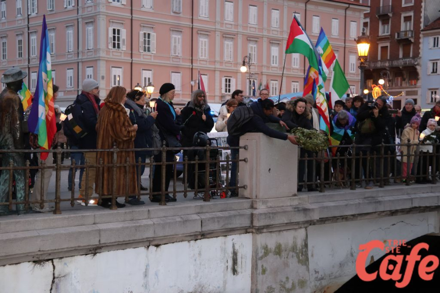 Il ritrovo è avvenuto alle 15 in piazza Unità d’Italia, davanti al Municipio, accanto alla targa delle leggi razziste. Da lì la marcia si è snodata attraverso diverse tappe dal forte valore simbolico, con una prima sosta davanti alla chiesa di San Nicolò, seguita dal passaggio in piazza Ponterosso, accanto alla statua di James Joyce. In questo punto è stato ricordato il tema delle migrazioni e delle migliaia di vittime morte annegate nel Mediterraneo, con fiori deposti in mare in segno di memoria.