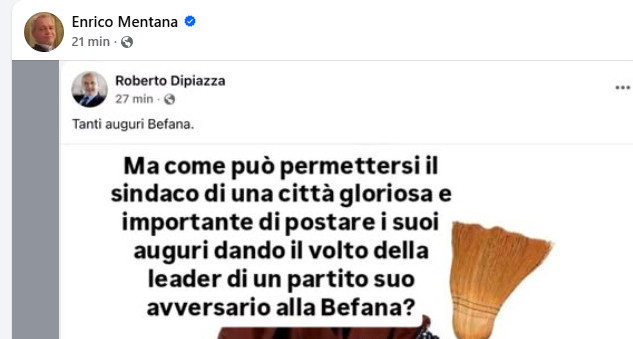 Il contenuto del post ha suscitato reazioni immediate. Tra queste spicca quella del giornalista Enrico Mentana, che ha ricondiviso l’immagine commentando duramente il gesto. Nella sua riflessione, Mentana si chiede come possa il sindaco di “una città gloriosa e importante” permettersi di pubblicare auguri utilizzando il volto della leader di un partito avversario associandolo a una figura caricaturale.