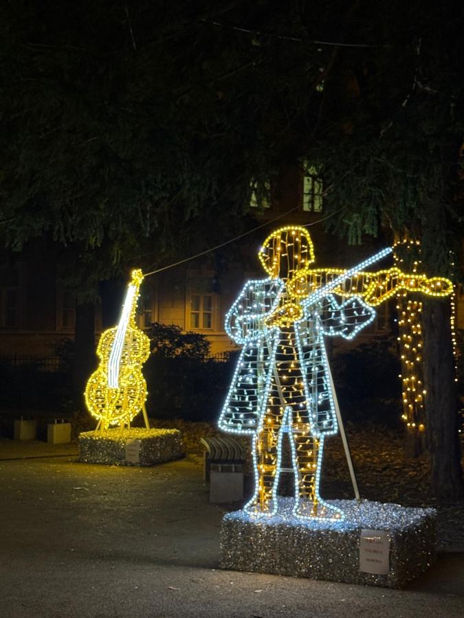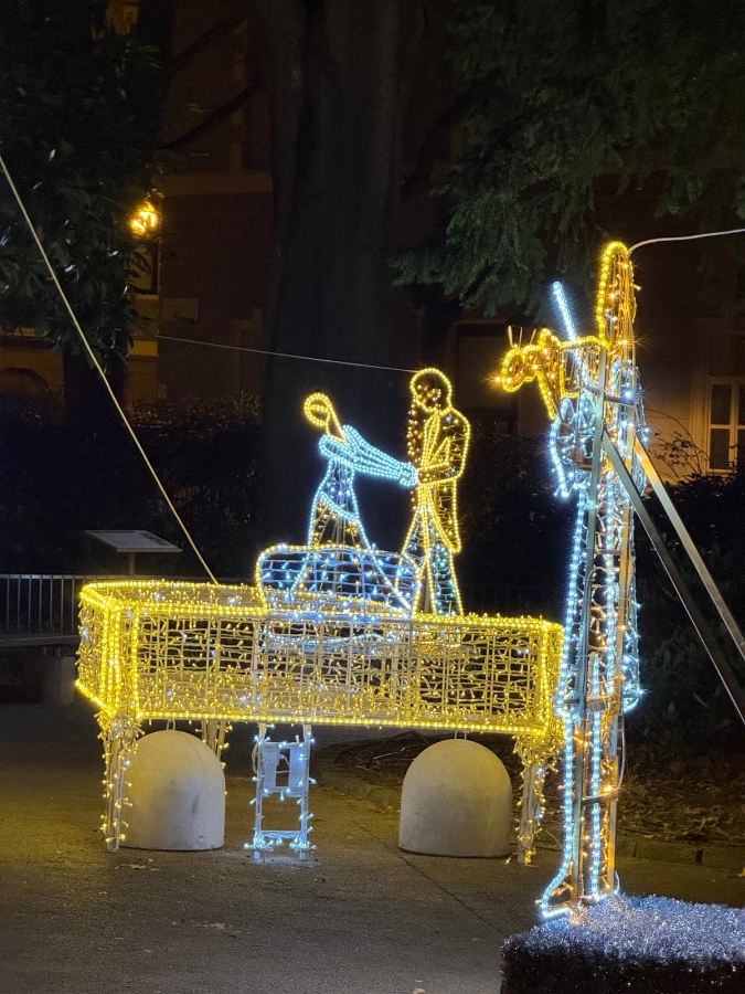 Passeggiando tra gli alberi secolari, il visitatore si ritrova circondato da una luminosa orchestra: un pianoforte scintillante, un violino che sembra vibrare nel silenzio della sera, una maestosa arpa modellata interamente in led, quasi sospesa nel buio. E poi loro, le figure luminose che danzano, eleganti come in una sala da ballo ottocentesca, avvolte in un bagliore caldo che sembra muoversi al ritmo di una musica immaginaria.