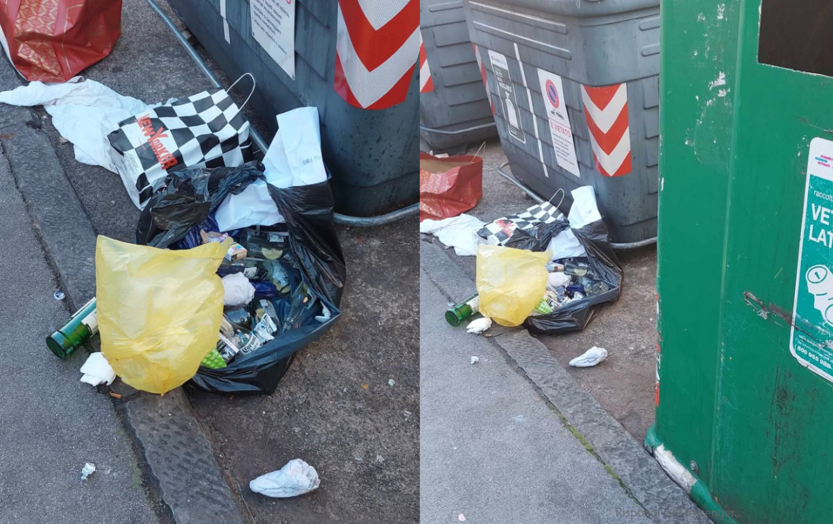 Le fotografie mostrano una situazione che difficilmente può essere attribuita a un semplice errore o a un conferimento sbagliato. I rifiuti non sono finiti accidentalmente fuori dal contenitore, ma sono stati lasciati intenzionalmente accanto al cassonetto, con il sacco aperto e il vetro sparso visibilmente.