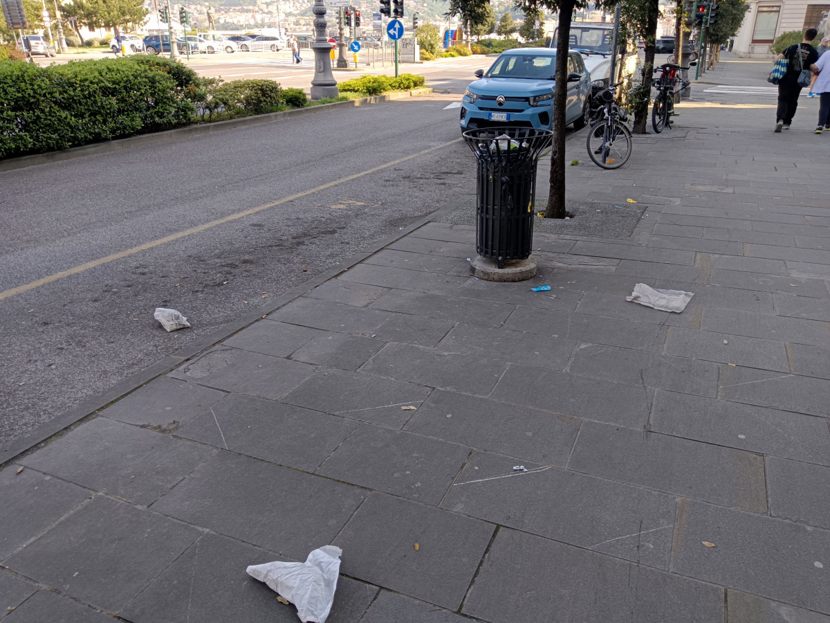 Le immagini mostrano rifiuti abbandonati lungo il marciapiede e nei pressi dei cestini, oltre a segnaletica danneggiata e spazi che appaiono poco mantenuti. Una situazione che colpisce soprattutto perché riguarda una delle zone più frequentate da cittadini e turisti.