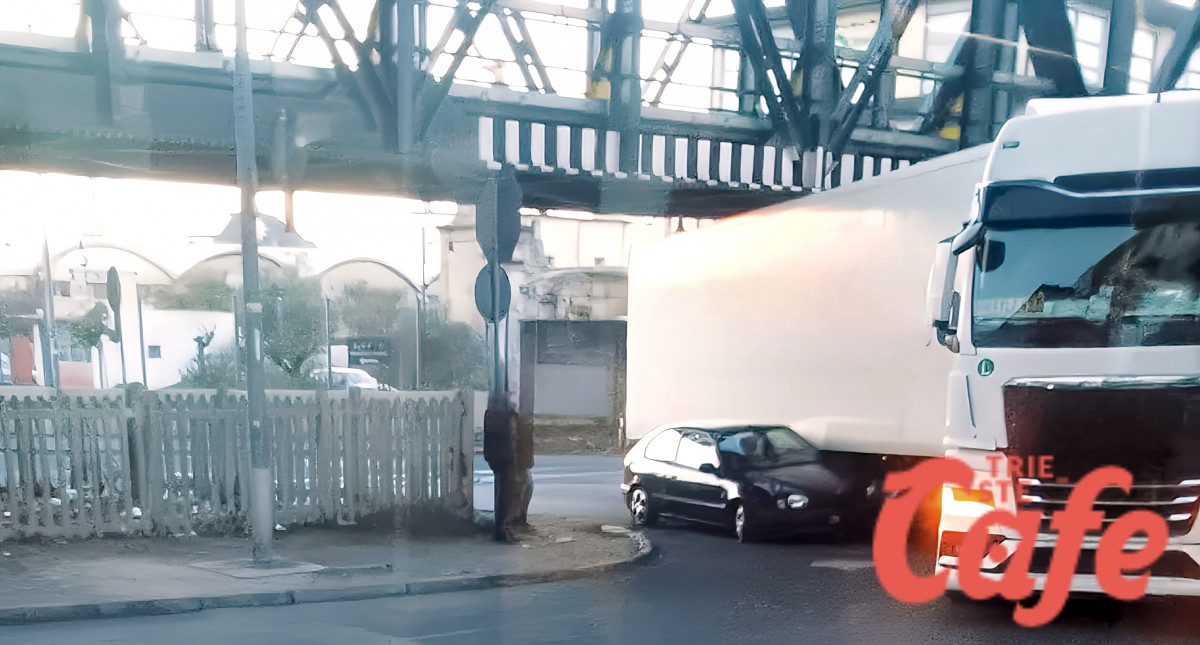 Trieste, auto si incastra accanto a un tir sotto il ponte di Scalo Legnami: rilievi in corso