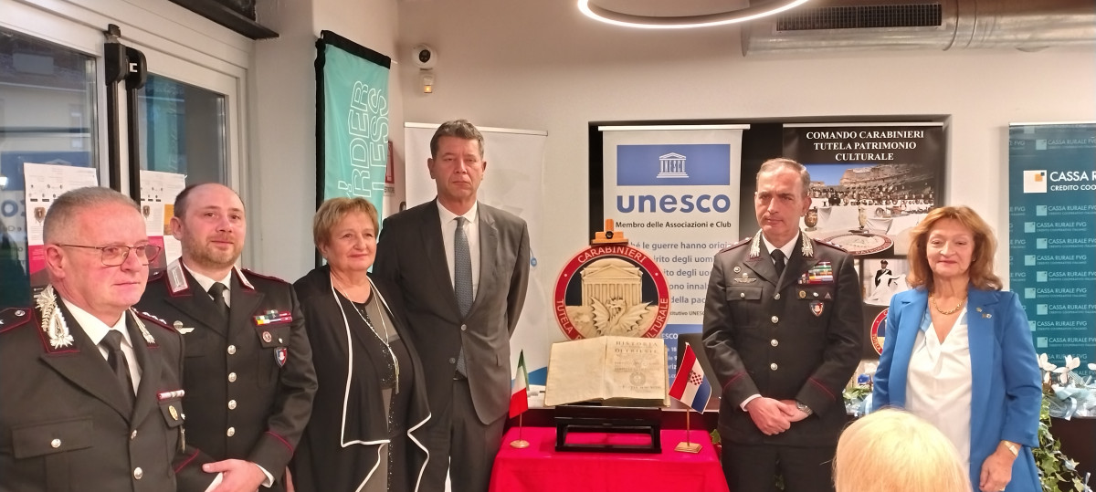 Il secondo momento simbolico ha avuto un respiro internazionale. I Carabinieri TPC hanno consegnato all’Ambasciatore di Croazia in Italia un rarissimo volume a stampa del 1698, trafugato durante una serie di furti avvenuti tra il 1982 e il 1985 ai danni della Biblioteca Nazionale e Universitaria di Zagabria, con un ammanco complessivo di oltre 1300 opere antiche.