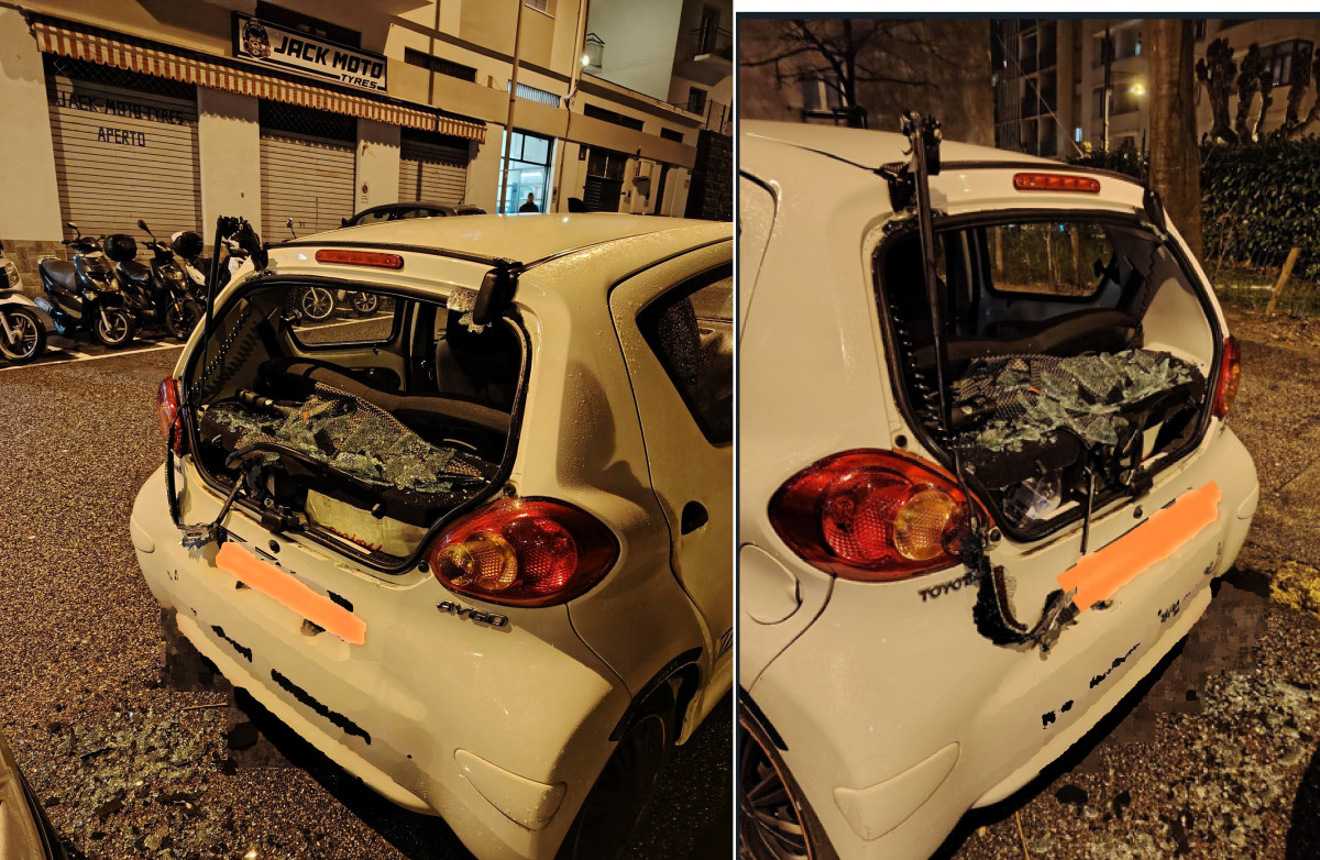 Alle 18:00 è arrivata la segnalazione che il lunotto posteriore era stato completamente distrutto. Nessun biglietto lasciato sul posto e nessuna indicazione utile per ricostruire l’accaduto.