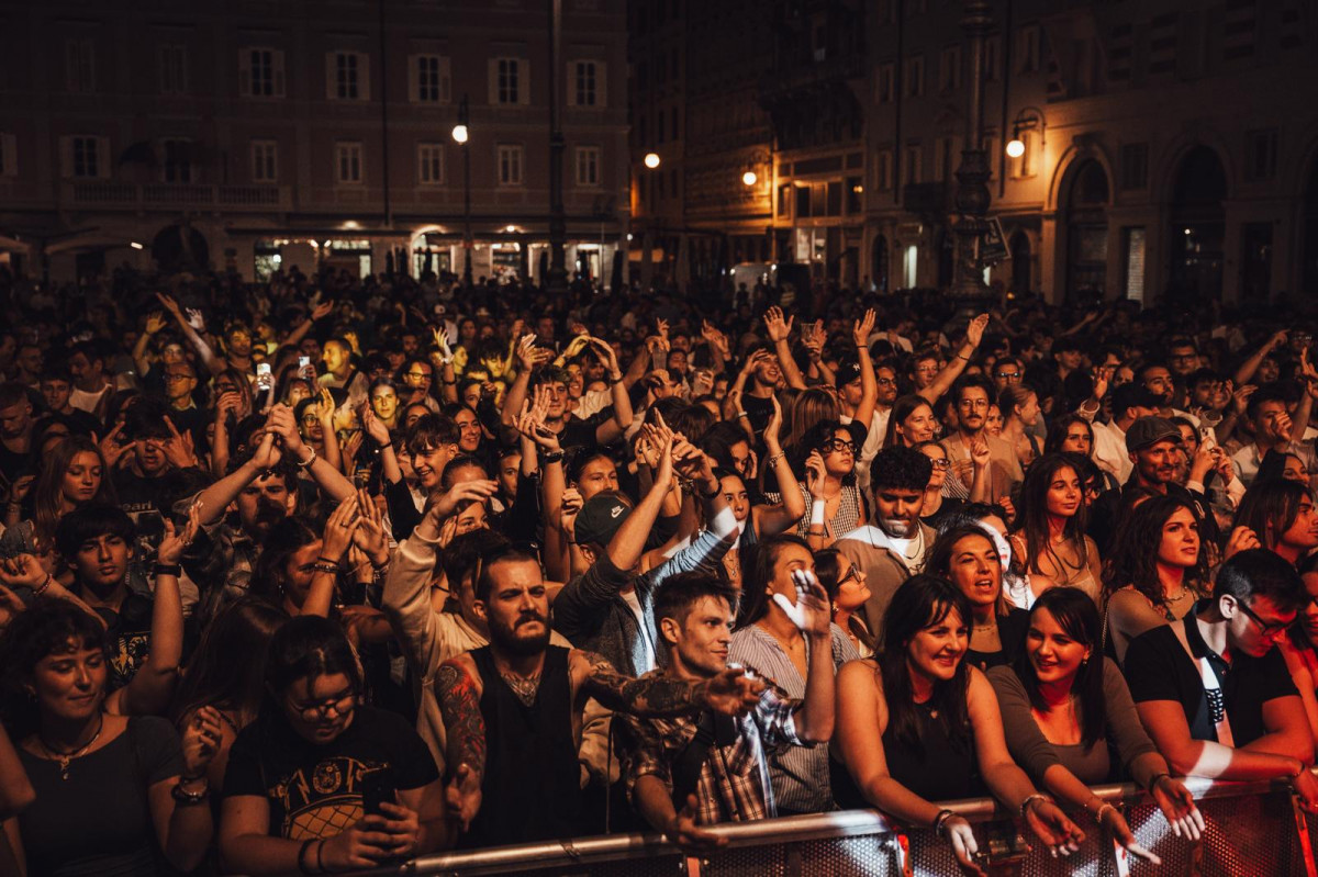 Zoccano definisce l’operazione con un concetto preciso: è stato creato, grazie alla collaborazione con il Comune di Muggia, uno spazio giovani pensato per un pubblico dai 15 ai 30 anni. Il senso non è “mettere musica per i giovani” in modo generico, ma costruire un contenitore con una logica dedicata, coerente e riconoscibile, affidando a Platinum la direzione artistica di quell’area. È qui che la novità prende forma: non un palco accessorio, ma un tassello programmatico che mira a dare identità a una piazza e a una fascia di pubblico, con una linea musicale guidata e non casuale.