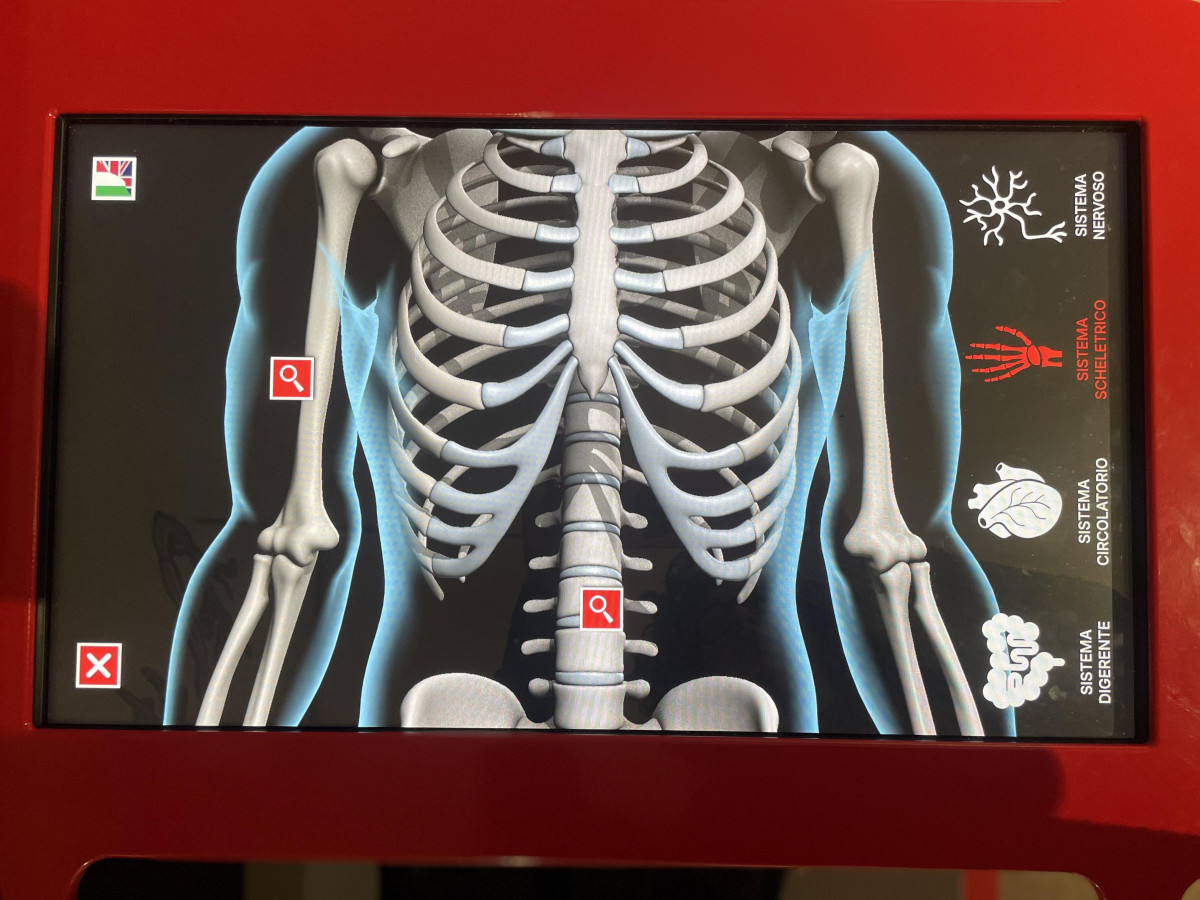 Con installazioi interattive, basta un tocco ed uno schermo e si potrà scoprire il funzionamento, posizione e dimensioni del sistema circolatorio, scheletrico, digerente e persino del cervello. Ma non solo, sarà possibile scoprire anche le diverse tecniche diagnostiche ci cui dispone oggigiorno la medicina, stiamo parlando dei raggi X, della risonanza magnetica, e persino il robot Da VInci che permette il compimento di operazioni chirurgiche microinvasive.