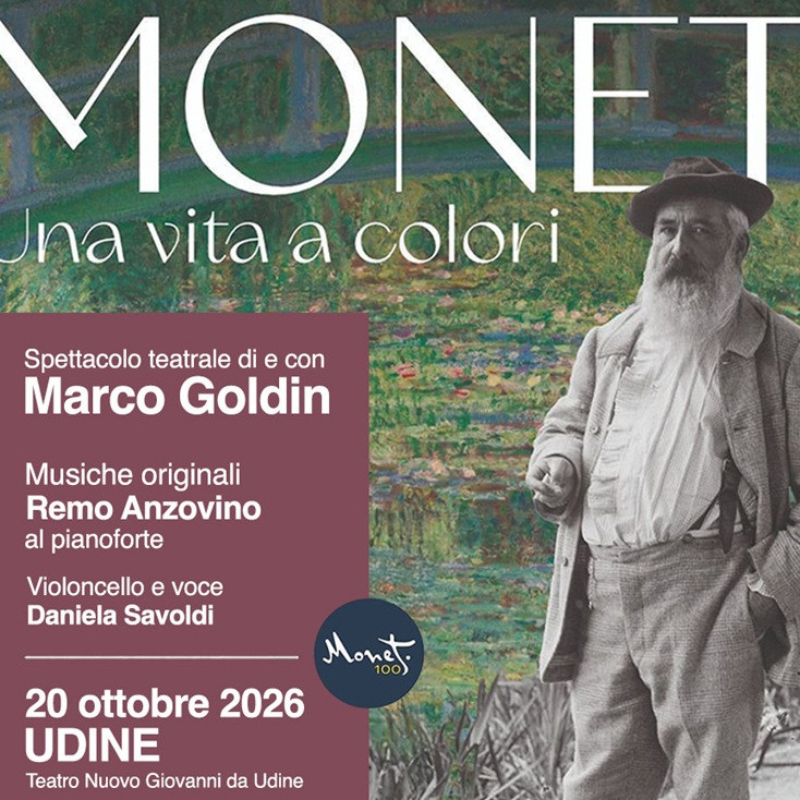 Dopo il grande successo di critica e pubblico ottenuto dagli spettacoli di Marco Goldin, La Grande Storia dell’Impressionismo e Gli Ultimi Giorni di Van Gogh, con una sessantina di repliche totali in tutta Italia e quasi 40.000 biglietti venduti, viene annunciato oggi “Monet. Una vita a colori”, il nuovo progetto teatrale dedicato alla vita e alle opere, coloratissime, di Claude Monet. Sarà una grande festa per gli occhi e per il cuore. Il 5 dicembre 2026 cadrà il centenario della morte del grande pittore, per cui sotto la sigla “Monet 100” andrà in scena uno spettacolo proprio per celebrare uno tra gli artisti più amati e influenti dell’intera storia dell’arte, che non solo è stato alla base della nascita dell’impressionismo ma ha attraversato, in lunghi decenni, la vicenda dell’immagine che in lui da figurativa si è fatta quasi astratta, fino al vero e proprio romanzo delle ninfee nel giardino di Giverny. Prodotto da Imarts, il tour del nuovo spettacolo di Marco Goldin, “Monet. Una Vita a colori”, approderà nei principali teatri italiani dal prossimo autunno: il 20 ottobre 2026 a Udine al Teatro Nuovo Giovanni da Udine. I biglietti per la data organizzata da VignaPR e FVG Music Live saranno in vendita dalle ore 11:00 di mercoledì 11 marzo online su Eilo.it, Ticketone.it e nei punti vendita autorizzati Ticketone.