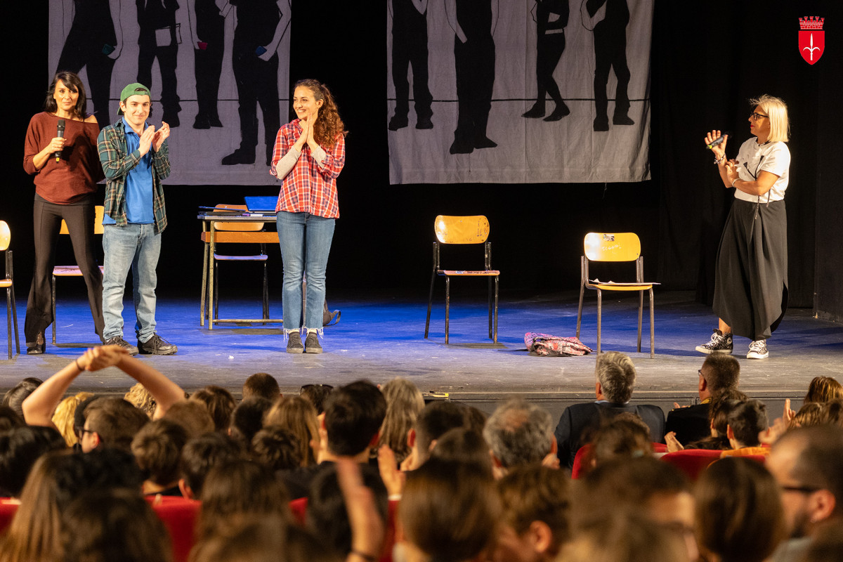 L'assessore alle Politiche sociali, Massimo Tognolli ha portato il saluto dell'Amministrazione comunale e del Sindaco ed ha aggiunto “condivido la gioia di vedere questo teatro pieno di ragazzi e ragazze. Oggi ascolterete tante persone che vi diranno cose importanti e serie. Ma voglio dirvi anche un’altra cosa, altrettanto seria: divertendosi si impara molto di più”. Annalisa Castellano ha letto la frase, scelta tra le 737 scritte dai ragazzi e dalle ragazze prima dello spettacolo, nelle classi, su cosa sia per loro il bullismo. “Ogni anno – ha detto la Castellano - ne scegliamo una. Quella di quest’anno è: “Il bullismo è una situazione in cui non hai nessuno al tuo fianco e resti sempre solo. Con questo spettacolo e con gli interventi di oggi, il nostro desiderio è che, alla fine, non vi sentiate più così soli”.