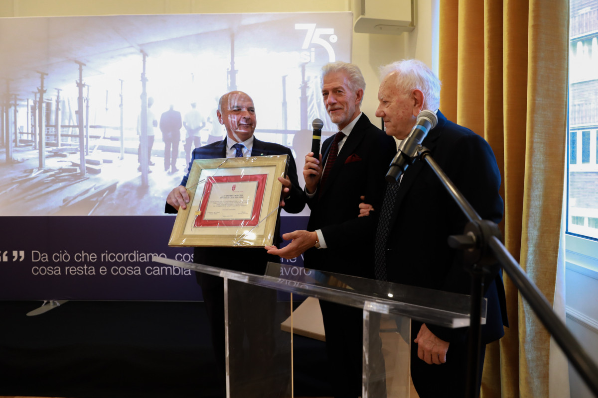 “Alla Ennio Riccesi Holding, in occasione del 75° anniversario della sua fondazione, per l’attività svolta con successo nel settore pubblico e privato delle costruzioni. Tre generazioni di appassionati professionisti. Con stima e gratitudine.”