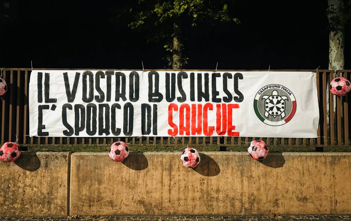 In occasione della partita di calcio tra Italia e Israele, disputata ieri sera a Udine, il movimento CasaPound Italia ha inscenato una protesta simbolica nei pressi dello stadio, appendendo palloni insanguinati e uno striscione con la scritta: “Il vostro business è sporco di sangue”.