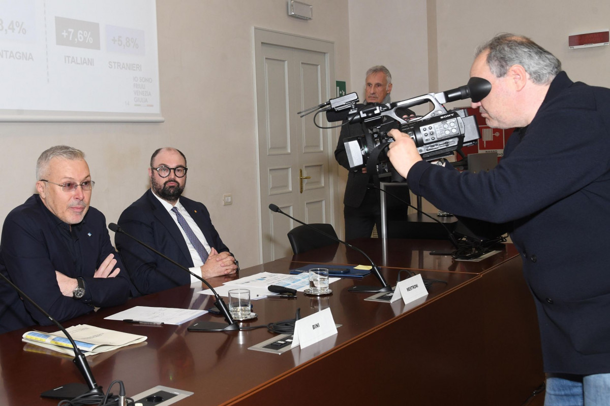 È stato sottolineato anche che i risultati della stagione invernale, sotto il profilo della frequenza sulle piste, sono stati in crescita nonostante la chiusura della Di Prampero dal 7 al 20 gennaio per far posto alla Coppa del Mondo, disputata il 17 e 18 gennaio, la quale è valsa però un impatto economico diretto di oltre 2 milioni di euro, con i suoi oltre 9 mila spettatori, i 150 operatori dei media, 15 emittenti e i 4.000/4.300 pernottamenti nella settimana dell'evento. Tra gli altri dati salienti spiccano la ventina di eventi in pista da dicembre a marzo, il successo dello skipass giornaliero adulto, che ha fatto segnare un incremento del 17 per cento, l'esito dello sci notturno a Tarvisio, che ha registrato un +25 per cento, e l'impatto della campagna social: 61 post hanno generato oltre 4 milioni di visualizzazioni. In totale nell'arco di tutto il 2025 le presenze turistiche in montagna sono state 1.317.759, con un più 8,4 per cento rispetto al 2024, nel contesto di un dato globale, inclusivo di tutti gli ambiti del Friuli Venezia Giulia, che registra 11 milioni di presenze nell'anno solare trascorso, per un +6,5 per cento rispetto al 2024. Su questo dato generale le presenze italiane sono aumentate del 7,6 per cento e le straniere del 5,8 per cento. Le città sono cresciute dell'11,5 per cento, il mare del 4,5 per cento e la montagna, come detto, dell'8,4 per cento. Montagna che si appresta ora a confermare la tendenza positiva anche nella stagione primavera/estate, "perché - ha concluso Bini - le nostre località si possono godere 365 giorni all'anno e su questa estensione dell'offerta ci stiamo applicando da anni con determinazione e tenacia".