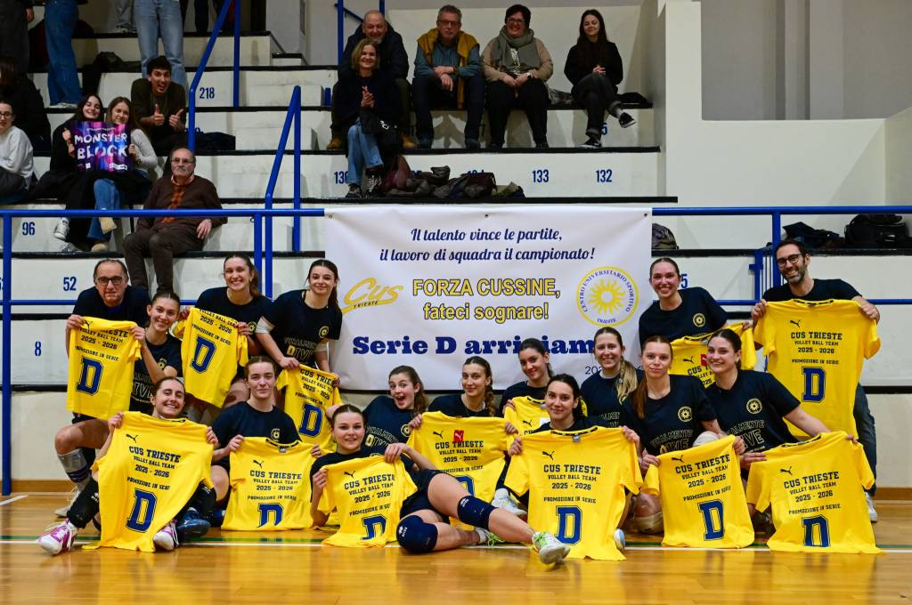 Un cammino quasi perfetto per un gruppo, affiatato e coeso, capace di dominare il campionato dalla prima giornata. Dopo due anni il CUS Trieste di pallavolo femminile torna in Serie D: la squadra di coach Federico Vivona ha conquistato, al penultimo turno del Campionato Territoriale di Prima Divisione, aritmeticamente la promozione alla Serie maggiore dopo aver superato con un netto 3-0 (25-21, 25-12, 25-14) l’Azzurra RdR tra le mura amiche della Palestra di Via Monte Cengio. Le cussine hanno giocato una partita, valevole per la 21ᵅ Giornata, ai limiti della perfezione, reagendo al meglio dopo il primo match point fallito lo scorso sabato con la seconda della classe, ovvero la Triestina Volley (impostasi al termine di una partita combattuta per 3-0 (27-25 27-25 27-25), e anticipando la festa prima dell’ultima partita prevista il 10 aprile in casa del Centro Coselli. “Questa promozione - racconta a caldo l’allenatore Federico Vivona - ripaga il lavoro e i sacrifici fatti negli ultimi due anni. La chiave di questa stagione formidabile, che ad una partita dal termine ci ha visto vincere 20 match e perderne solamente uno lo scorso sabato, è stato il gruppo, un gruppo omogeneo che mi ha permesso di far giocare, anche nel match decisivo, tutti gli elementi a mia disposizione. Contro l’Azzurra abbiamo iniziato un pò contratti, con nella testa ancora qualche strascico dello stop di sabato, ma poi le ragazze si sono sciolte e hanno disputato una grande partita”. Contro l’Azzurra, il CUS Trieste ha faticato soltanto nel primo set quando le padrone di casa hanno preso il largo “solamente” nel finale, trascinate dai servizi vincenti di De Vidovich. Dopo aver messo in cassetto il set d’apertura per 25-21 negli altri due set non c’è stata partita il CUS che ha sempre comandato le operazioni di gioco e non rischiando nulla. Il tabellino della partita decisiva: C.U.S. TRIESTE – AZZURRA RDR 3 – 0 (25 – 21, 25 – 12, 25 – 14) A.S.D. C.U.S. Trieste: Giulia Vescovi 1, Marta Tomasella 3, Silvia Cestaro 15, Chiara De Vidovich 8, Irene Mullig 14, Annalisa Sabbadini 2, Anna Zanardi, Hana Lapic 6, Letizia Maffi 1, Michela Venerus 1. Matilde Benetton, Viviana Boria 8, Isabella Ramani L1, Alice Ciotti L2 1° Allenatore Federico Vivona 2° Allenatore Amir Shariat