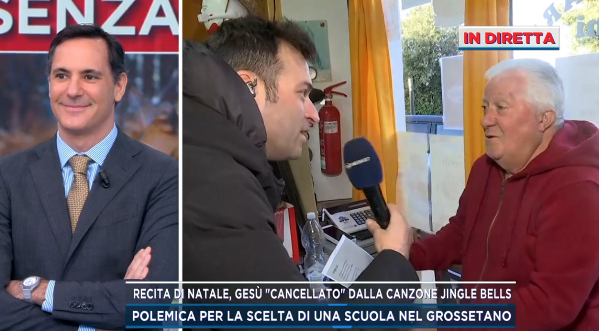 Nel corso del collegamento in diretta, l’inviato ha raccolto le impressioni di commercianti e residenti, molti dei quali hanno espresso disagio e perplessità. Una signora ha commentato: “Hanno accontentato uno e scontentato tutti”, mentre un’altra ha sottolineato che la scelta non sarebbe stata discussa con i genitori, che se ne sarebbero accorti ascoltando i figli ripassare il testo a casa. Tra le domande che circolano nel paese, una in particolare continua a emergere: perché sostituire “Gesù” con “Natal”?