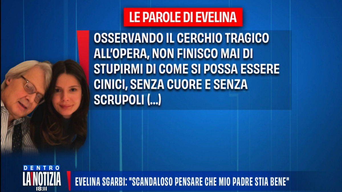 L’intervento, trasmesso in prima serata, ha riacceso l’attenzione mediatica sulla condizione di salute e sulla gestione pubblica di Vittorio Sgarbi, da mesi al centro di polemiche e tensioni familiari. Evelina ha definito “scandaloso e falso” il racconto di chi sostiene che suo padre stia bene, sottolineando che “è un’altra persona, completamente diversa da quella che conoscevo”.