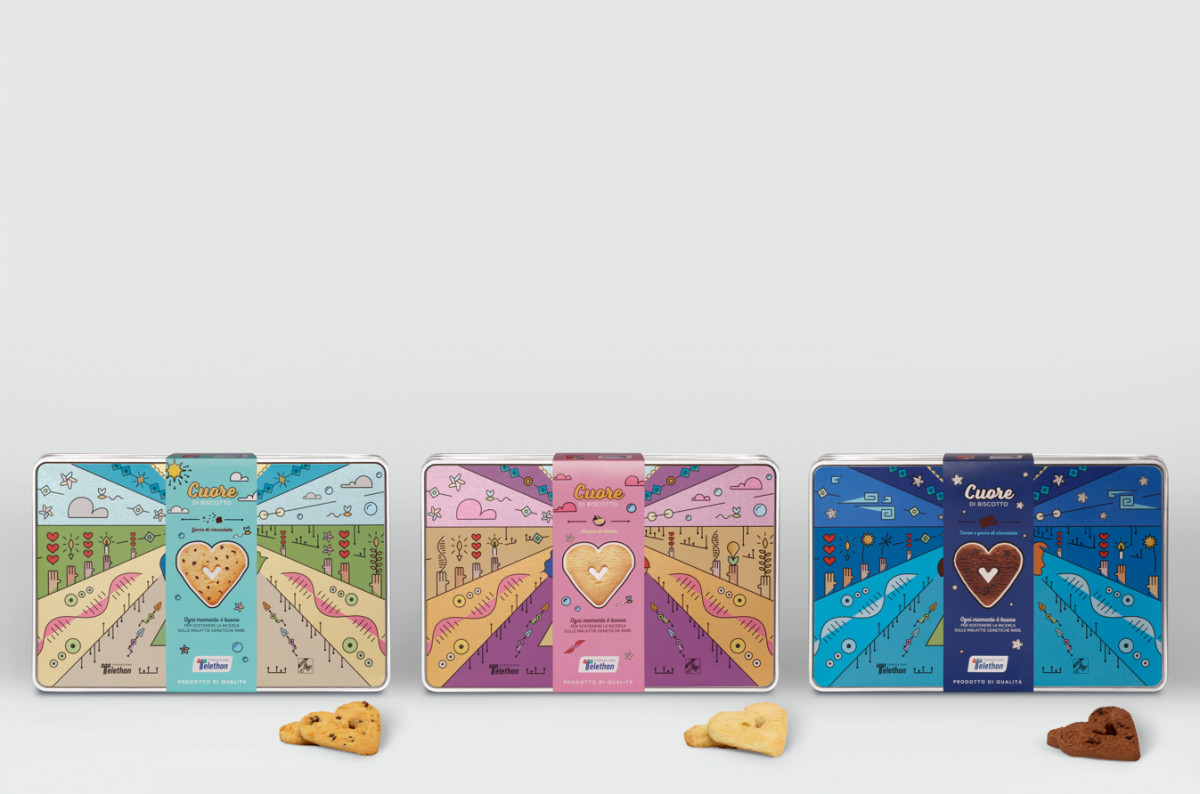 I Cuori di biscotto, realizzati con passione dalla storica pasticceria genovese Grondona nata nei primi dell’Ottocento, sono biscotti di pasta frolla a forma di cuore, ideali per ogni momento della giornata, dalla prima colazione al dopo cena, e disponibili in tre gustose varianti: con gocce di cioccolato, integrali, e al cacao e gocce di cioccolato. Anche quest’anno le scatole di latta, curate nei minimi dettagli, sono prodotte in tre diversi colori metallizzati che identificano il gusto del biscotto: azzurro per la variante con gocce di cioccolato, rosa per l’integrale e blu per il gusto cacao con gocce di cioccolato. Ogni scatola, collezionabile e inserita in una shopper coordinata, rappresenta un momento della giornata: il sorriso dell’aurora, la poesia del tramonto e l’abbraccio della sera. La nuova veste grafica rappresenta il sostegno della grande squadra di Fondazione Telethon: una comunità che trasforma l’impegno, la conoscenza e la solidarietà in speranza, futuro e cura.