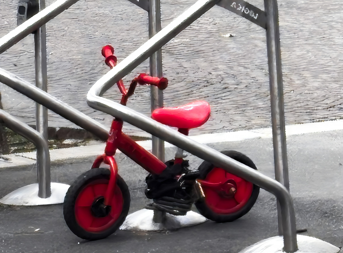 Nel cuore del centro di Trieste, qualcuno ha notato una piccola bicicletta rossa – di quelle utilizzate dai bambini – accuratamente legata alla rastrelliera con catena e lucchetto, come se si trattasse di una normale bicicletta da adulto.