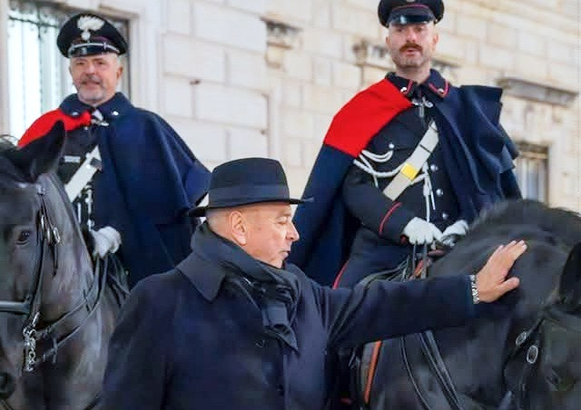 Attorno a lui, i Carabinieri a cavallo, imponenti nella loro uniforme cerimoniale, conferiscono alla scena un tono epico, quasi d’archivio storico. Le luminarie stanno per accendersi in tutta la città, ma l’immagine più luminosa del pomeriggio è proprio quella: un uomo e un animale che si riconoscono, si rispettano, si parlano senza parole.