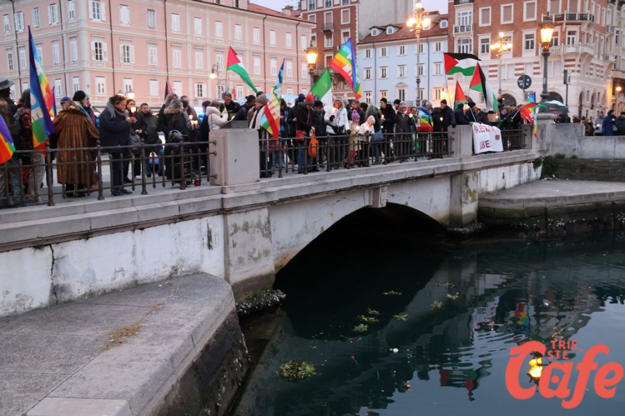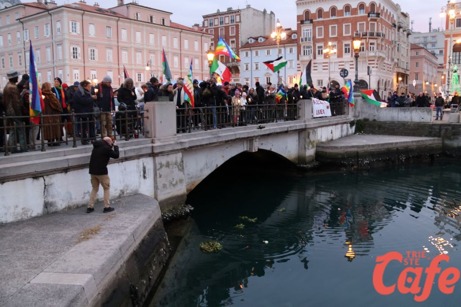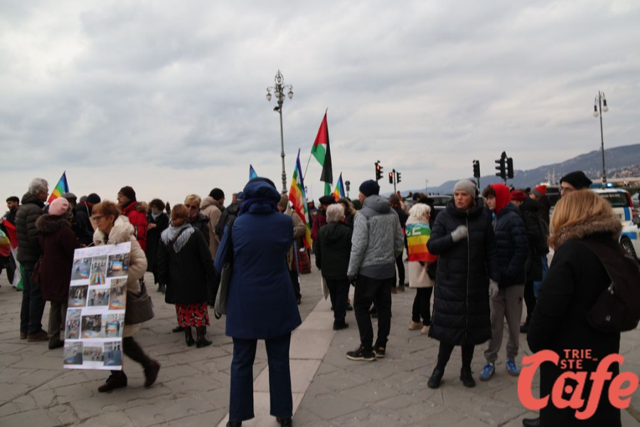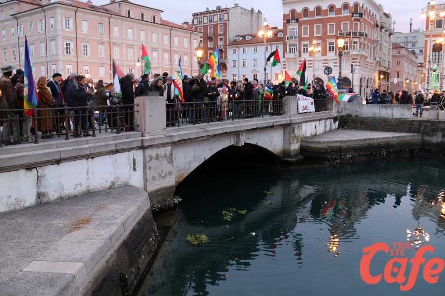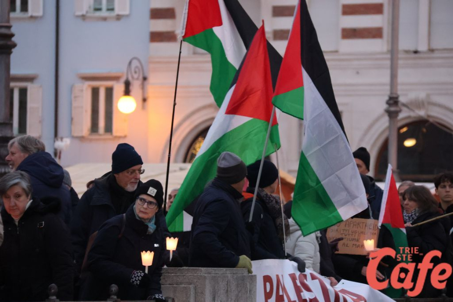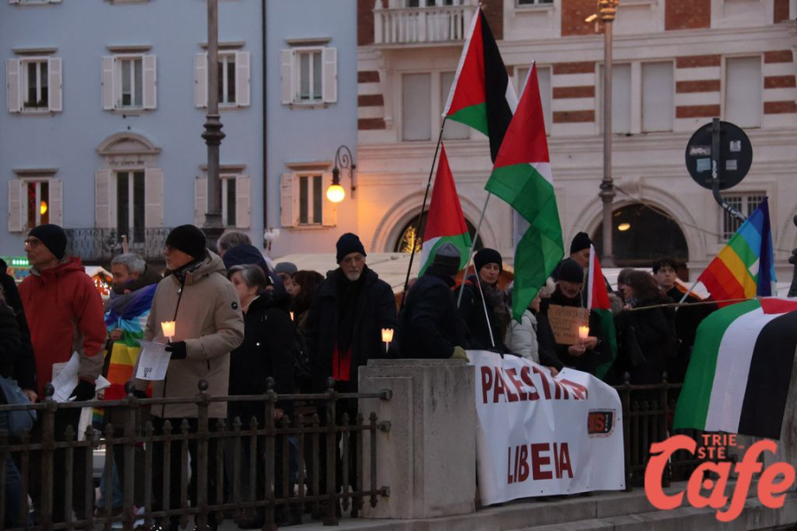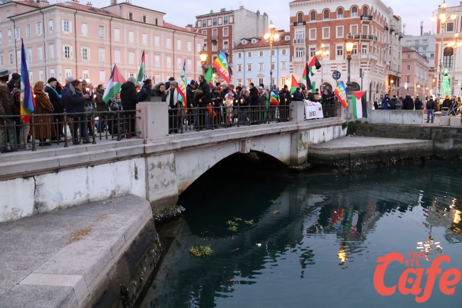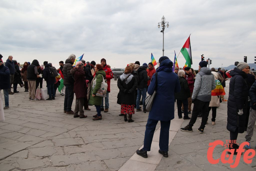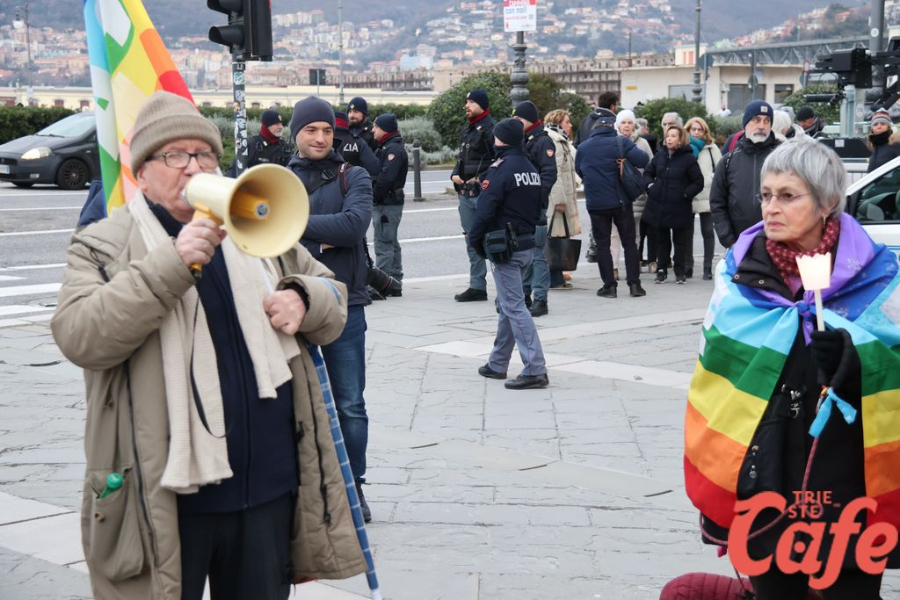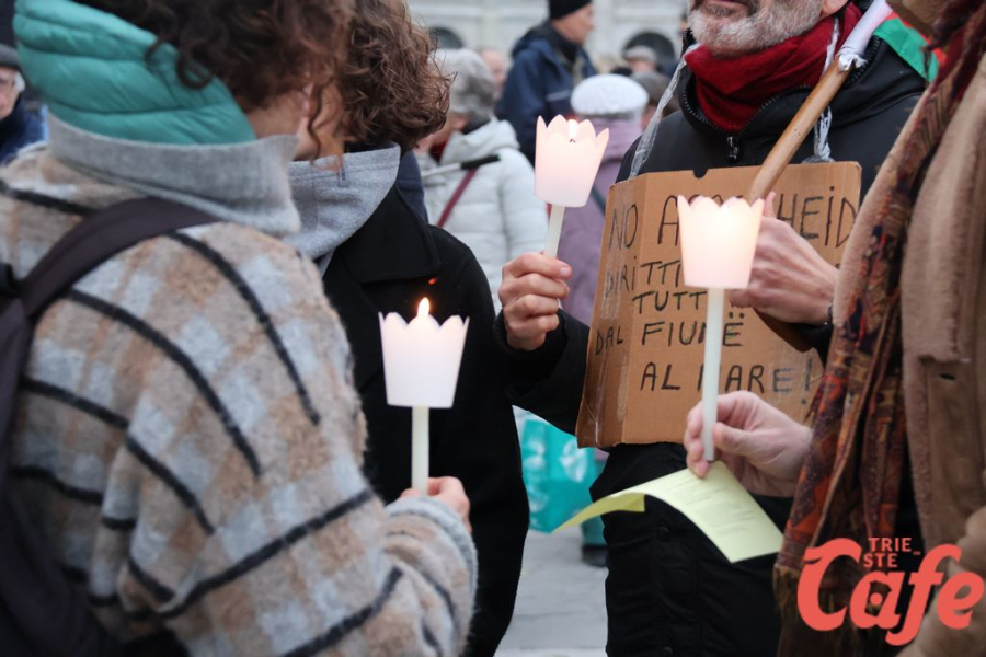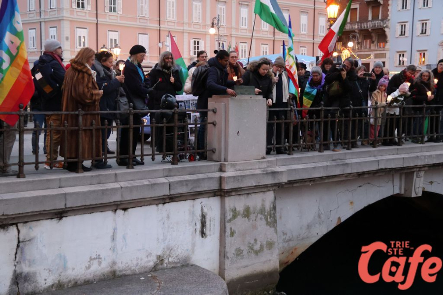Il ritrovo è avvenuto alle 15 in piazza Unità d’Italia, davanti al Municipio, accanto alla targa delle leggi razziste. Da lì la marcia si è snodata attraverso diverse tappe dal forte valore simbolico, con una prima sosta davanti alla chiesa di San Nicolò, seguita dal passaggio in piazza Ponterosso, accanto alla statua di James Joyce. In questo punto è stato ricordato il tema delle migrazioni e delle migliaia di vittime morte annegate nel Mediterraneo, con fiori deposti in mare in segno di memoria.