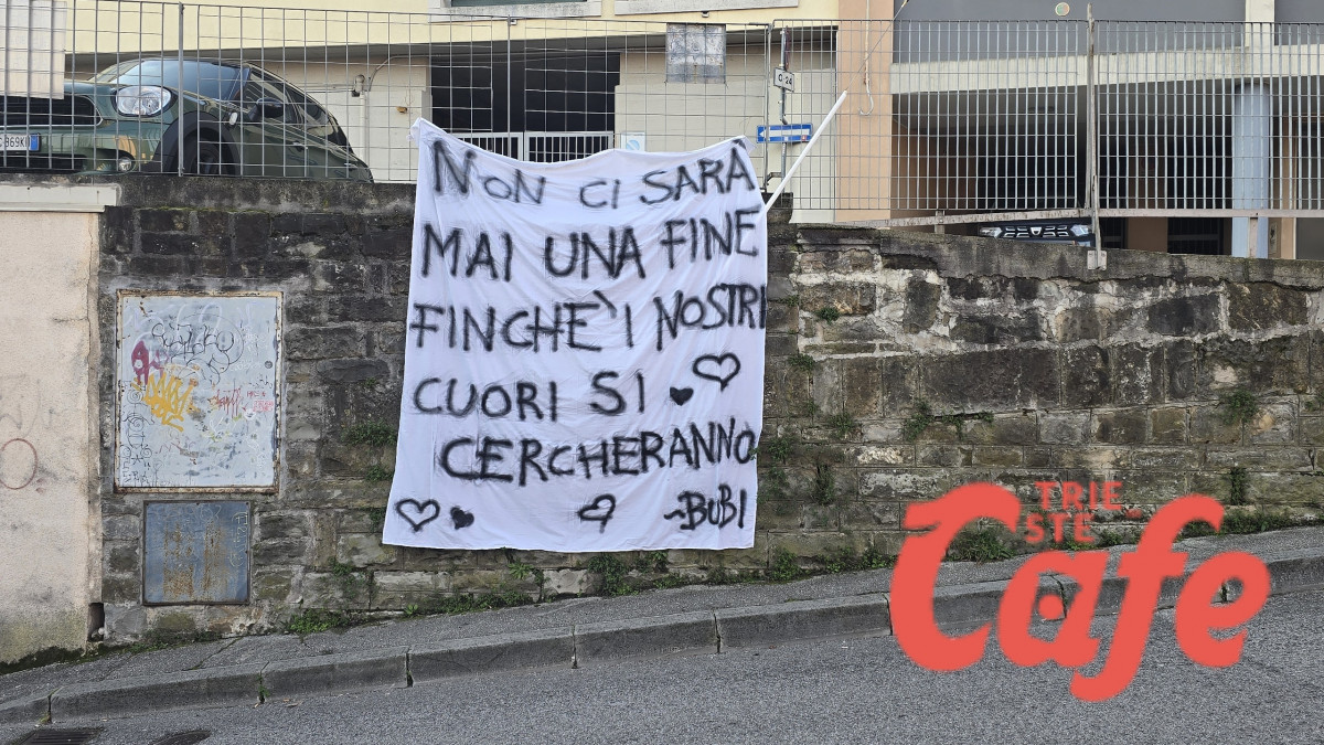 Questa mattina, lunedì 23 febbraio 2026, i residenti e i passanti di via del Destriero a Trieste hanno notato un lenzuolo bianco affisso lungo il muro, con una frase scritta a grandi lettere nere e accompagnata da piccoli cuori.