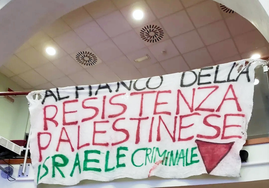 Il messaggio, scritto in rosso e verde e calato dal ballatoio della sala, recita: “Al fianco della resistenza palestinese”. L’occupazione, diffusa tramite i canali social degli stessi promotori, è stata annunciata con l’invito a raggiungere l’aula occupata per partecipare a iniziative di confronto, dibattito e solidarietà.