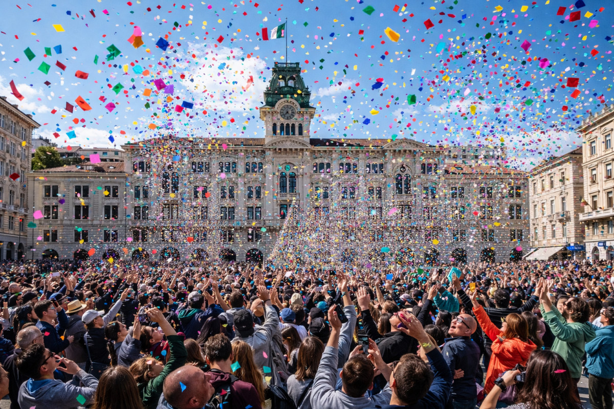 Immaginate per un attimo piazza Unità trasformata in un quadro vivente. Il cielo limpido, il mare sullo sfondo e, all’improvviso, una pioggia di coriandoli colorati che si solleva nell’aria, danza tra le persone e ricade lentamente come una carezza leggera.
