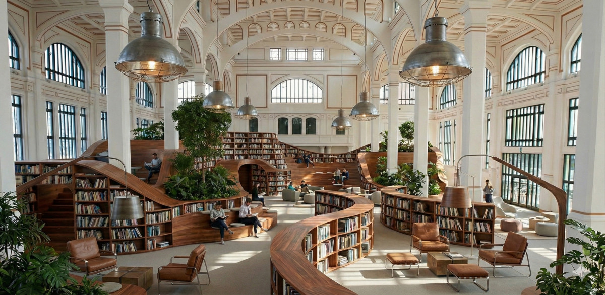 L’idea parte dal rispetto dell’identità architettonica del salone degli Incanti, valorizzandone le ampie volumetrie, la luce naturale e il respiro monumentale. All’interno, scaffalature sinuose in legno, percorsi fluidi, aree di lettura diffuse e spazi informali pensati per accogliere persone di ogni età, trasformando l’edificio in una vera “cattedrale laica” del sapere.