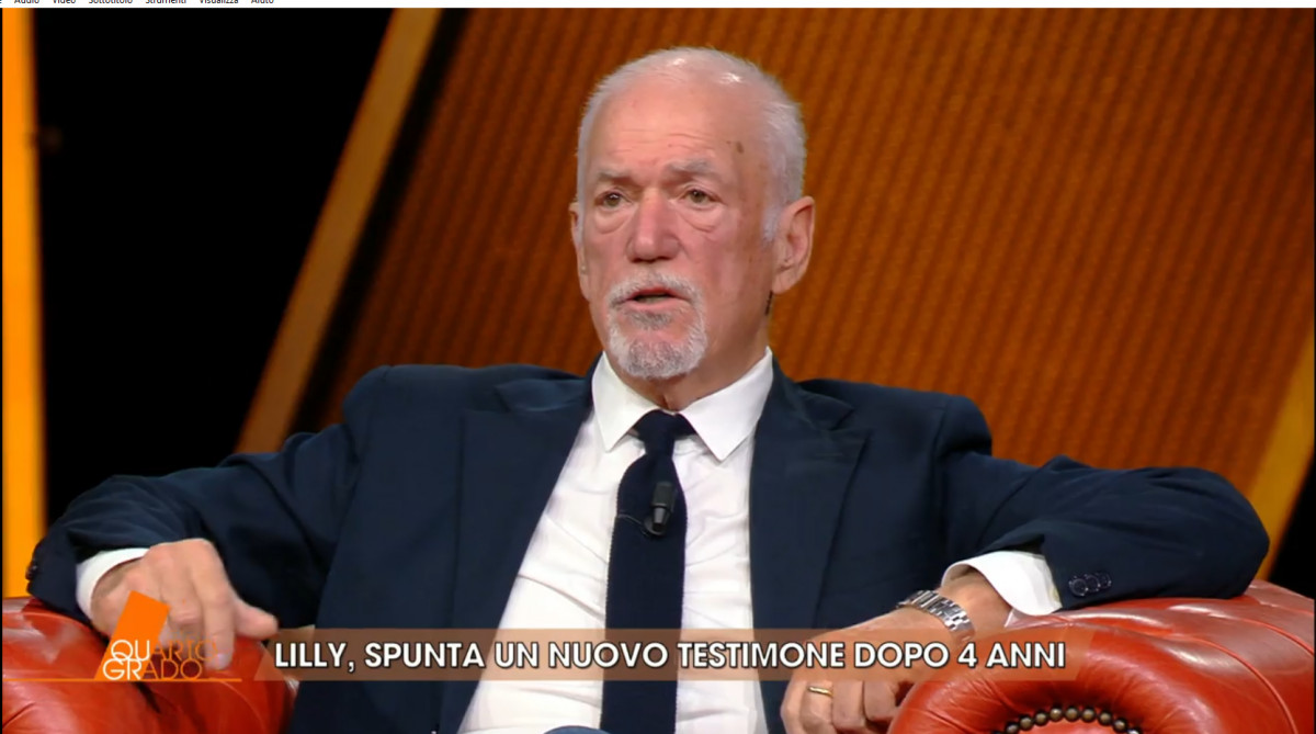 Il volto segnato e i capelli bianchi completano un’immagine di sobrietà matura, mentre la postura composta sul divano arancione dello studio conferma un atteggiamento attento ma misurato. L’insieme comunica rispetto per il contesto e consapevolezza del ruolo di ospite in una trasmissione che affronta un caso complesso e doloroso.