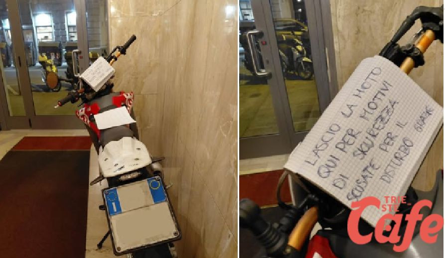 Trieste, moto parcheggiata nell’androne del condominio con biglietto: “L’ho messa qui per sicurezza”