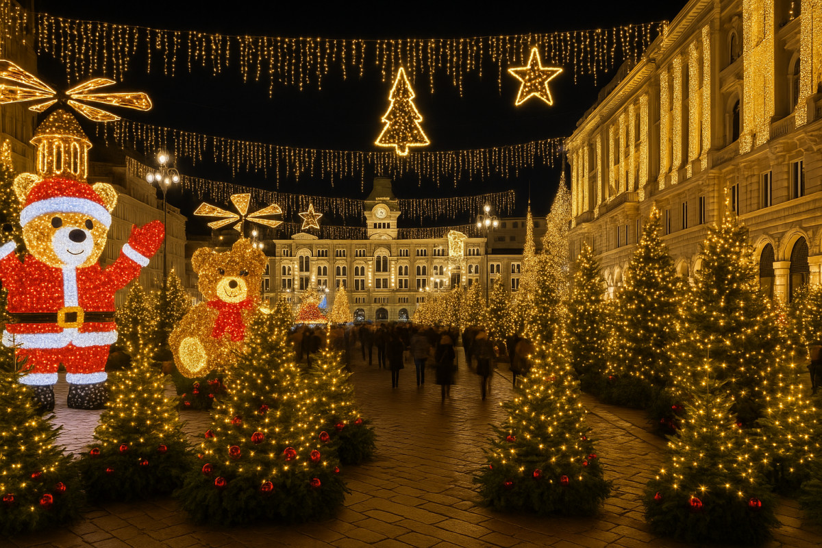 Nella fantasia della triestina, ogni angolo avrebbe una sorpresa scintillante: piazze ricolme di decorazioni dalle dimensioni colossali, vie trasformate in tunnel luminosi, incroci adornati con architetture natalizie così maestose da far quasi fatica a camminarvi sotto.