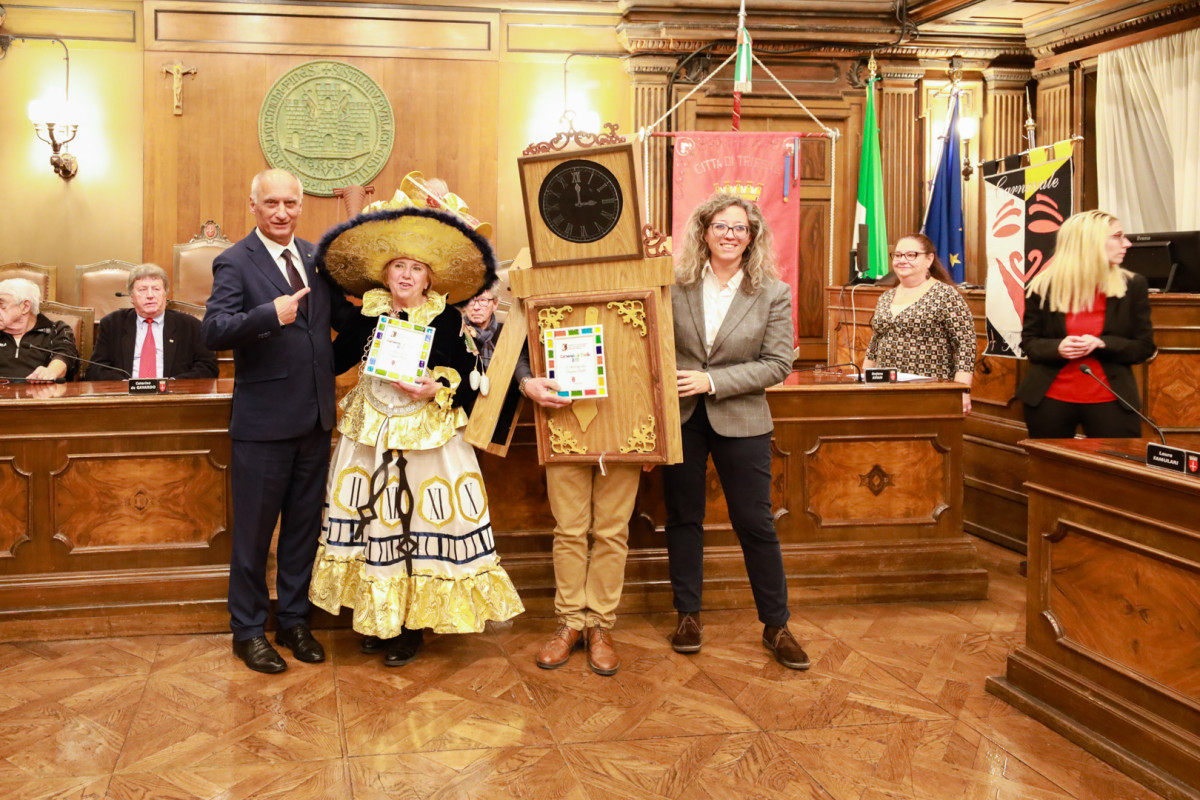 La Sala del Consiglio Comunale si è trasformata oggi in un vibrante teatro di festa, gratitudine e tradizione per la cerimonia ufficiale di premiazione del Carnevale di Trieste 2025, un appuntamento che ha riunito rioni, gruppi, maschere singole e coppie, insieme a tutti coloro che hanno contribuito alla riuscita della manifestazione più colorata dell’anno.