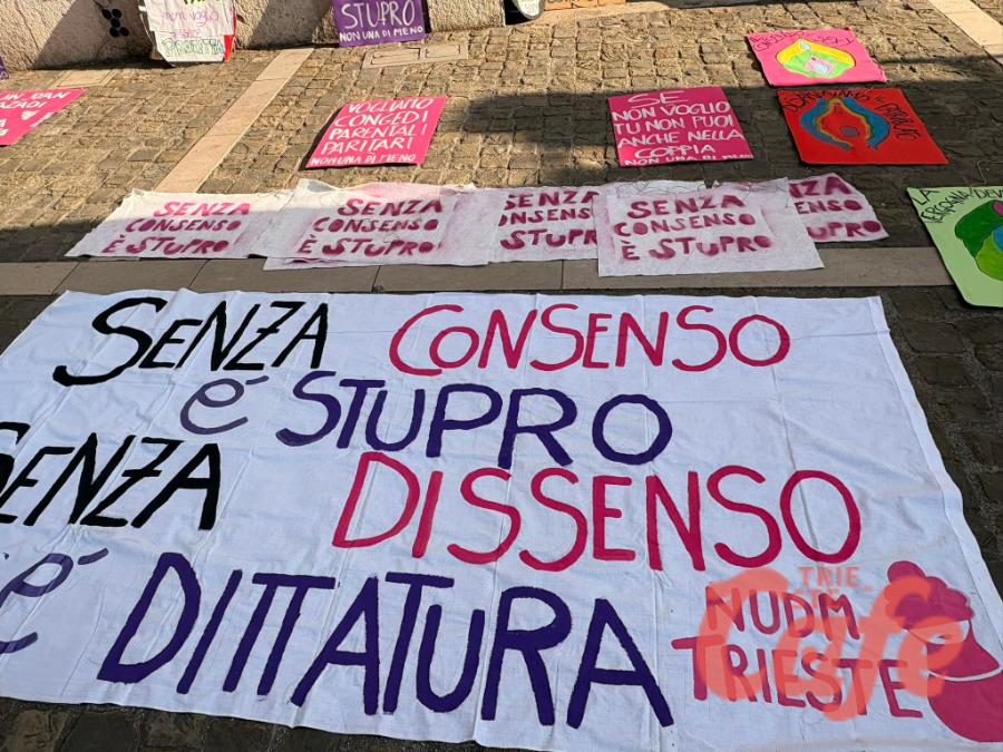 Tra i messaggi visibili lungo il percorso compaiono slogan contro la violenza e richiami al tema del consenso, oltre a rivendicazioni legate ai diritti delle donne, al lavoro e alle condizioni sociali.