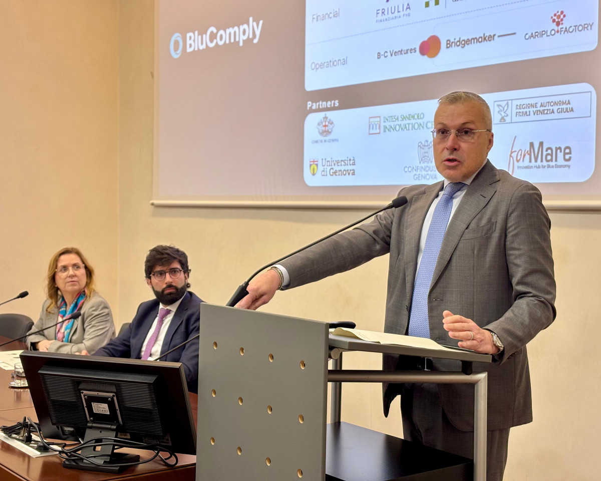 Blu Comply, guidata da Enrico Giancaterina, è una piattaforma di Regulatory technology che, grazie all'intelligenza artificiale, riduce fino all'80% il tempo dedicato alla documentazione di conformità, automatizzando il monitoraggio normativo, la generazione di documenti e lo scambio dati con i cantieri. Maritime Ventures è un'iniziativa lanciata da Cdp Venture Capital e gestita operativamente da Cariplo Factory e Bridgemaker, che aggrega investitori come Fincantieri, Friulia, Psa Italy,Fondazione Compagnia di San Paolo, Neva Sgr, con il supporto di partner istituzionali come Regione Friuli Venezia Giulia, Comune di Genova, Università di Genova, Confindustria Genova, ForMare e la collaborazione di Intesa Sanpaolo Innovation Center. "Oggi supportare la nascita di startup è fondamentale perché, nonostante la congiuntura socio-politica internazionale la nostra economia tiene, ma dobbiamo ragionare in prospettiva e favorire il mondo dell'impresa del domani e la crescita dei giovani imprenditori", ha aggiunto Bini.
