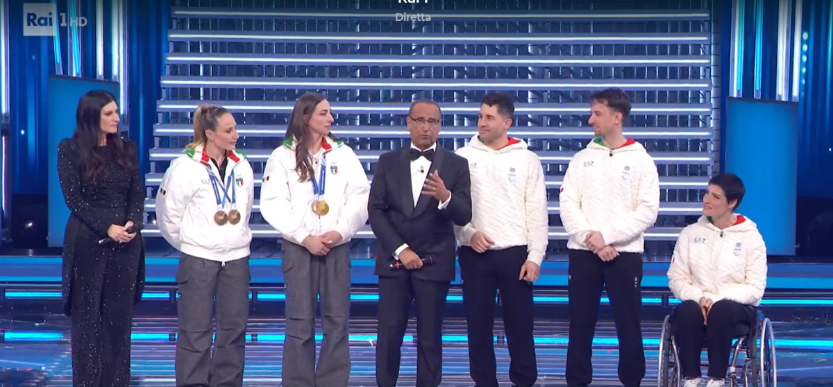 (askanews) - Sul palco dell'Ariston è il momento dello sport e dell'orgoglio nazionale per le medaglie ottenute ai Giochi di Milano-Cortina. "Ci inchiniamo di fronte a voi", dice Laura Pausini accogliendo e presentando Francesca Lollobrigida, doppio oro nel pattinaggio di velocità e di Lisa Vittozzi, primo oro olimpico della storia italiana del Biathlon. "L'emozione più bella - ha detto Lollobrigida - è stata vedere mio figlio sugli spalti, ma voglio dire grazie a tutti gli italiani perché sto ricevendo tantissimo amore ed è un grande orgoglio per me". "Sono davvero orgogliosa - ha aggiunto Vittozzi - di aver portato il primo oro in Italia". Sul palco anche Giacomo Bertagnolli, con la guida Andrea Ravelli, per lo sci alpino, e Giuliana Turra, del curling. In prima fila Giovanni Malagò, presidente Fondazione Milano-Cortina, che ha invitato a seguire "le Paralimpiadi nello stesso modo con cui sono state seguite le Olimpiadi" perché "i paralimpici sono degli eroi moderni". Ssa-Avl-Lua