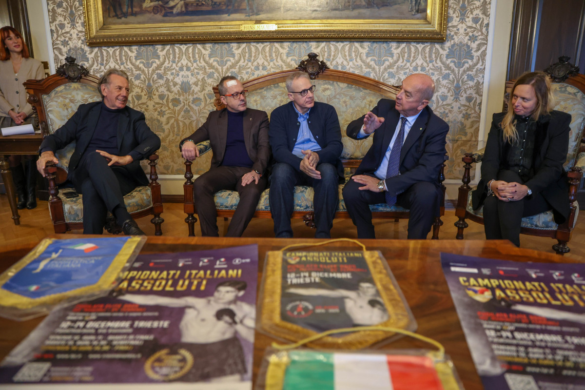 Il sindaco Roberto Dipiazza, l'assessore comunale allo Sport Elisa Lodi, l'assessore regionale Fabio Scoccimarro, il presidente di Trieste Pugilato Roberto Battimelli e Luca Zorzenon, presidente del Comitato regionale della Federazione pugilistica italiana, hanno presentato i campionati e le iniziative correlate questa mattina in conferenza stampa in Sala Giunta.
